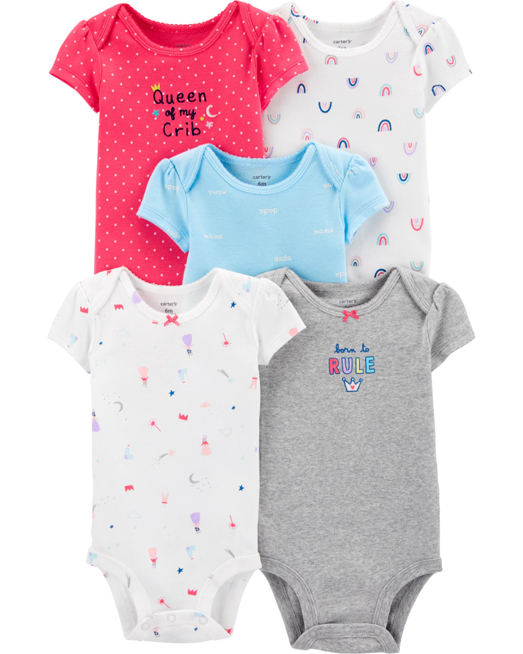 Diseñados con algodón súper suave y mucho amor, estos increíbles bodys son el comienzo perfecto de cualquier atuendo._Pack 5__Mangas cortas__ Broches sin níquels__Hombros expandibles para facilitar la colocación sobre lacabeza__Graficos de princesas__Eslogan "MAMA, DADA" __ Eslogan y corona "BORN TO RULE" ___Estampa de arcoíris__Eslogan, corona, estrellas y luna bordadas "QUEEN OF MY CRIB"_100% algodón___ Importado__ Lave en lavarropa_