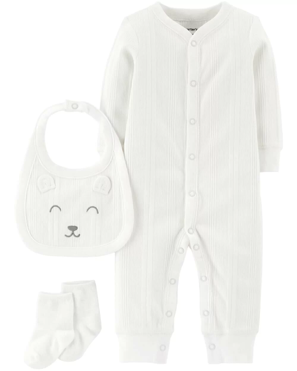 Perfecto para los primeros días en casa, este suave set está compuesto por un enterito con broches y pequeños extras: babero y mediecitas. Un tierno bebé de pies a cabeza.Set de 3 piezas_body con broches_puños acanalados_medias tejidas_cara de oso bordada en el babero con orejas 3D.57% algodón_38% poliéster_5% elastano_Importado_lavable en lavarropas.