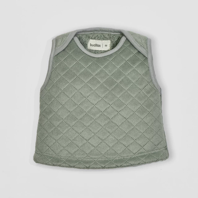 Chalequito de piel o coral fleece soft verde seco divino, con vivo en el borde al tono, super calentito. Ideal para poner sobre un body manga larga o sobre un bucito de frisa para los dias de frio. Tiene corte americano, lo que permite que se abra el cuello para poder vestir facilmente a tu Budita. En su trama tiene rombitos.