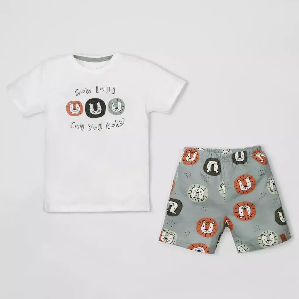 Este conjunto está compuesto por una remera de algodón estampada, delicadamente decorada con un aplique bordado de leoncitos que le da un toque único y tierno. La bermuda, confeccionada en tela rústica en un vibrante color verde, está completamente estampada con leoncitos, ideal para acompañar a los niños en sus aventuras diarias con comodidad y estilo.