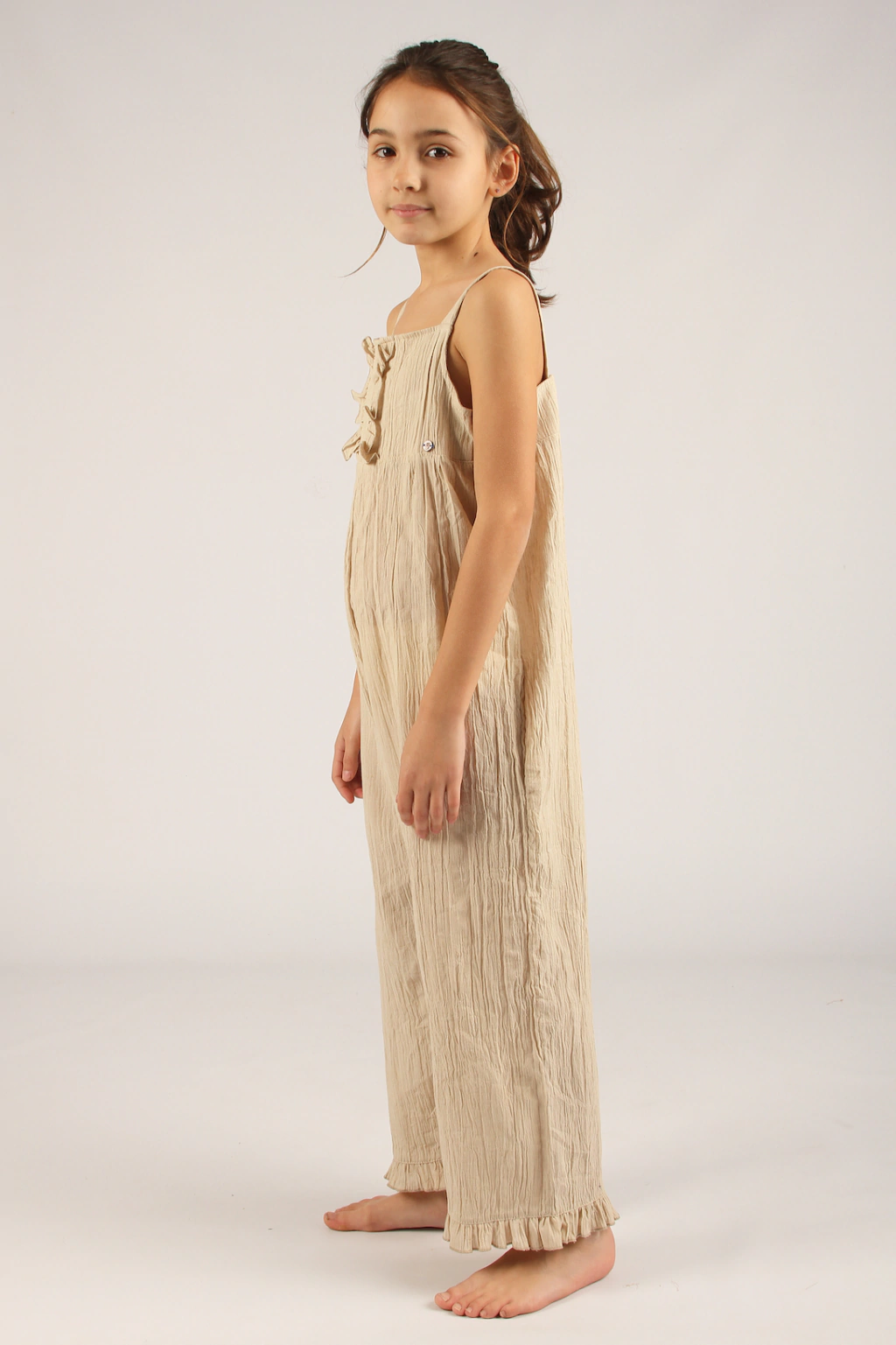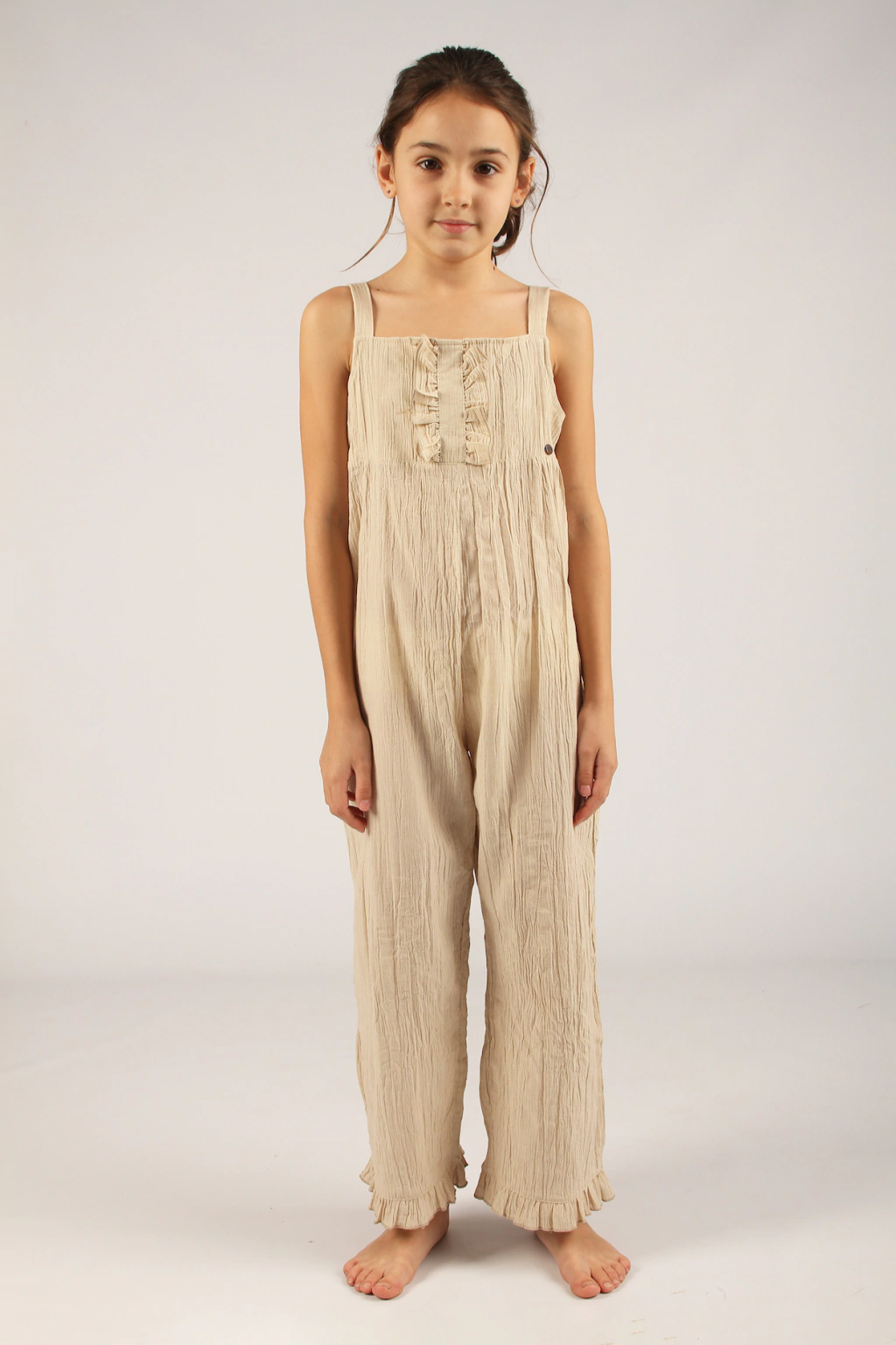 Este encantador Enterito de lino combina frescura y estilo. Los breteles son ajustables en la espalda y se cierran con botones de coco, lo que añade un toque natural. En la pechera y en el ruedo de las piernas, tiene delicados volados que le dan un toque de dulzura y elegancia. Es una prenda que refleja sencillez y encanto.