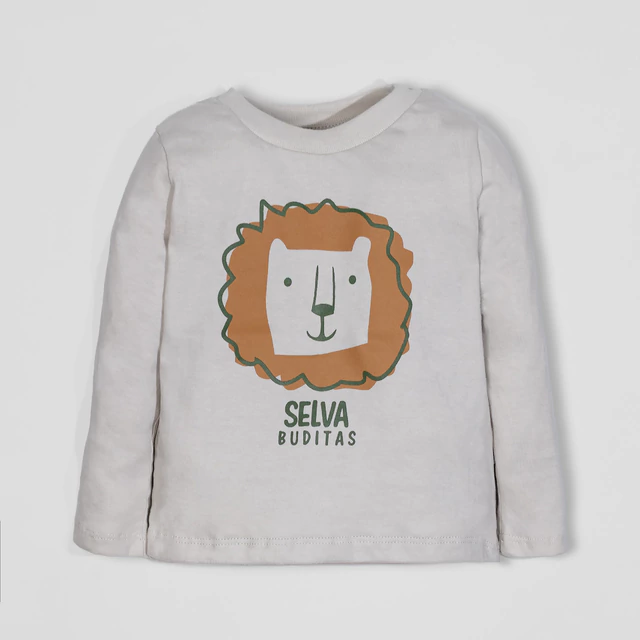 Camiseta de algodón color vison calro con una estampa central de un simpatico leoncito. Es de corte amplio estilo bucito, liviano y muy práctico. No tiene frisa. Es una prenda super versatil y cómoda, para usar todo el día y en cualquier ocasión, además en hiper combinable.